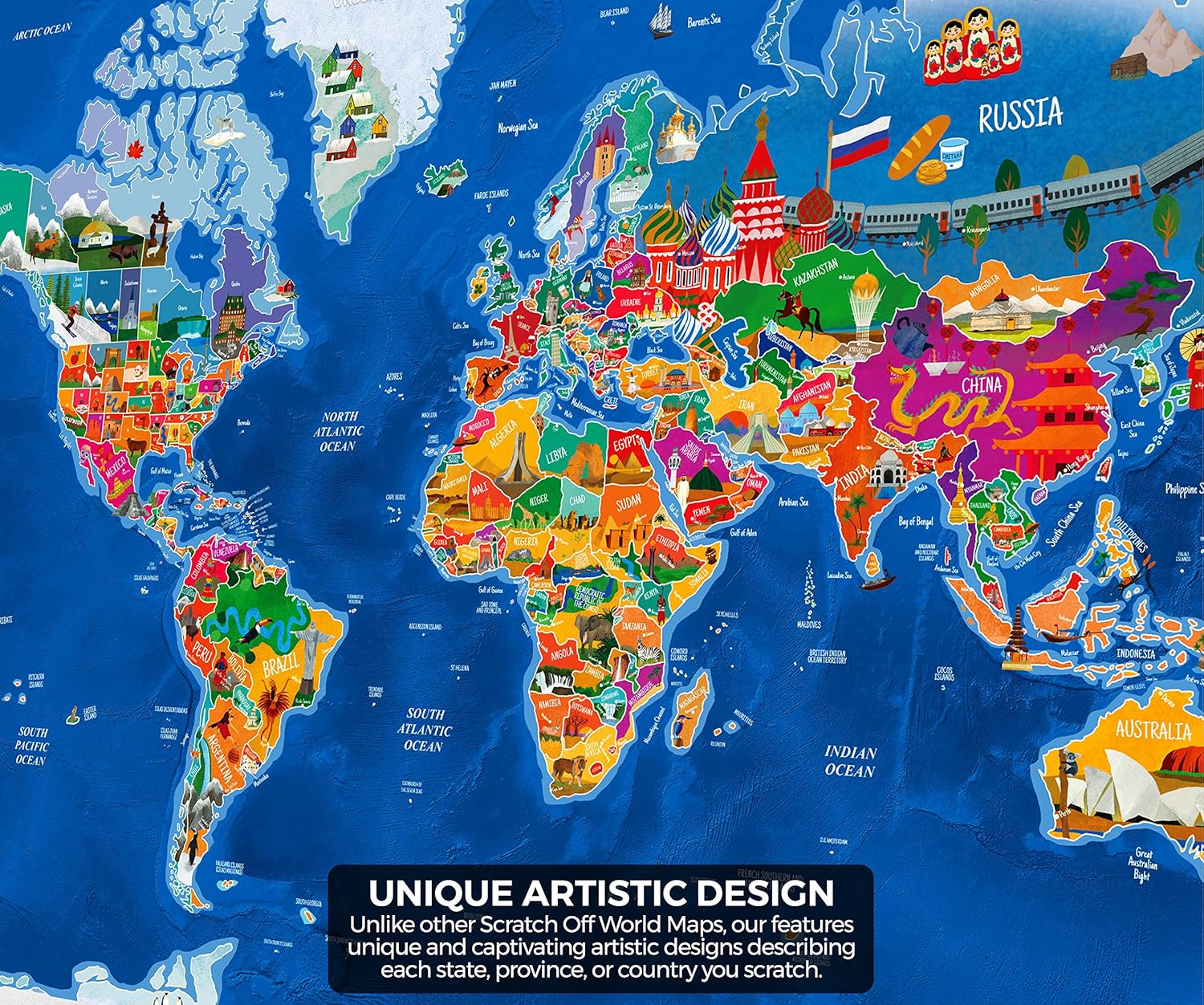School Educational Supplies Large Wall Poster With Handmade Artistic Illustrations Enfy Scratch Off Map Of The World Bonus Scratcher 3m Stickers Included With All Europe Countries And Usa States Stationery